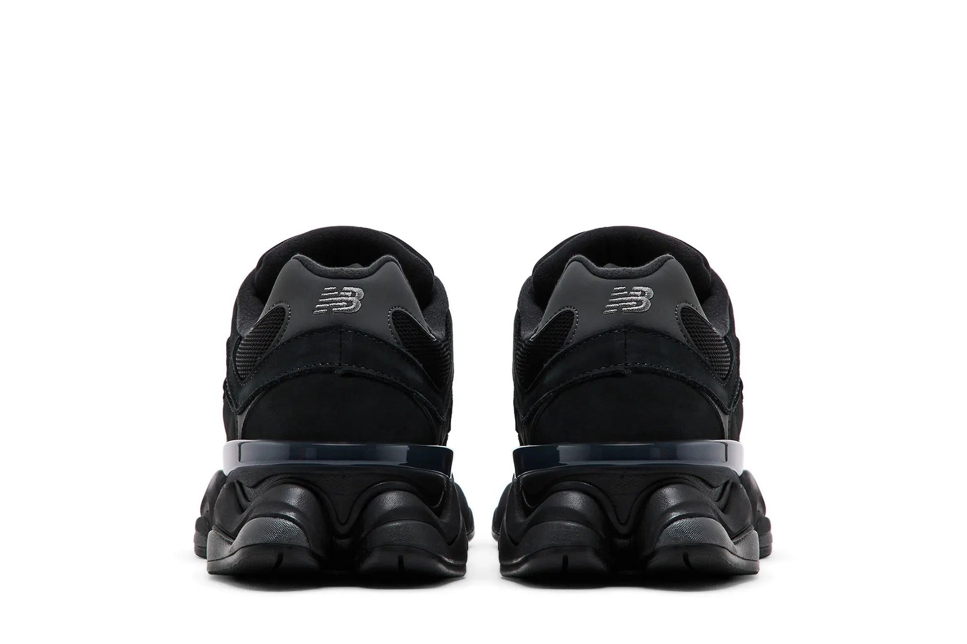 The 9060 'Black Cat' is constructed from breathable black mesh with tonal nubuck and synthetic leather overlays. A large 'N' logo graces the quarter panel, while a jeweled NB 9060 tag decorates the padded tongue. The sneaker rides atop a dual-density foam midsole, treated to a matching black finish and featuring a blend of New Balance's ABZORB and SBS cushioning.