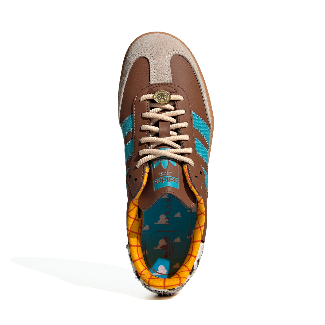 The Samba OG "Pixar" brings animated fun to a heritage silhouette with a design inspired by Woody from Toy Story. Featuring a rich brown upper, sky-blue side stripes, and a neutral suede toe overlay, this edition adds playful detailing with a yellow plaid lining and cow-print heel tab. The gum sole keeps the classic Samba DNA intact, while the mix of textures and colors captures the magic of the beloved character.